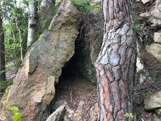 Nu ville vi ju, hur som helst, se en grotta, så vi gjorde ett nytt försök lite närmare Kolmårdens djurpark. Precis efter parken svänger man höger ner och nu gick det bättre, för vägen till grottan var utmärkt (Kopparbogrottan). På vägen, på vandringsleden, hittade vi rester av en gammal järngruva.