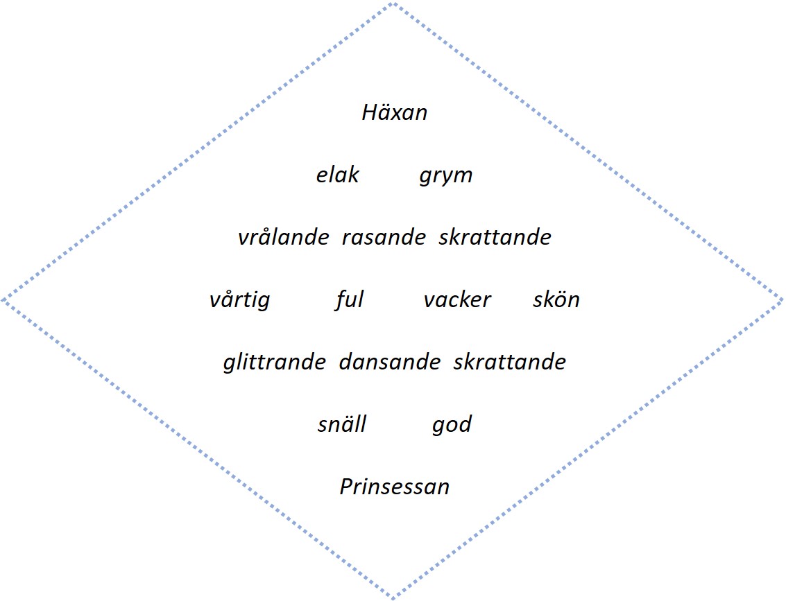 Orden skrivs in i denna speciella form som bildar, närapå, en diamant – därav namnet. Man börjar att beskriva det första substantivet, för att efter halva dikten byta till det andra. Så här kan det bli om en häxa och en prinsessa…