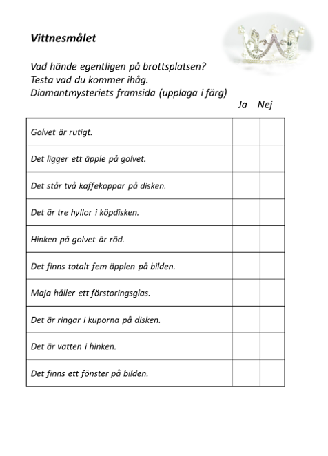 Om jag skulle göra om uppgiften skulle jag visa bilden på smartboarden en kort stund och sedan låta eleverna svara på frågorna. Kanske också diskutera med dem som sitter närmast, om de vill, för att se om de har sett samma sak. Kan bli en intressant diskussion om minnet.