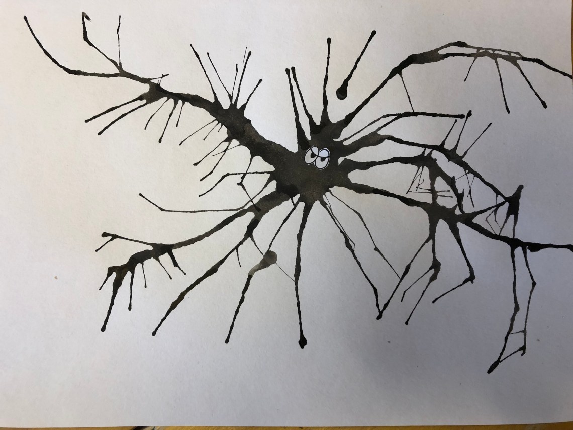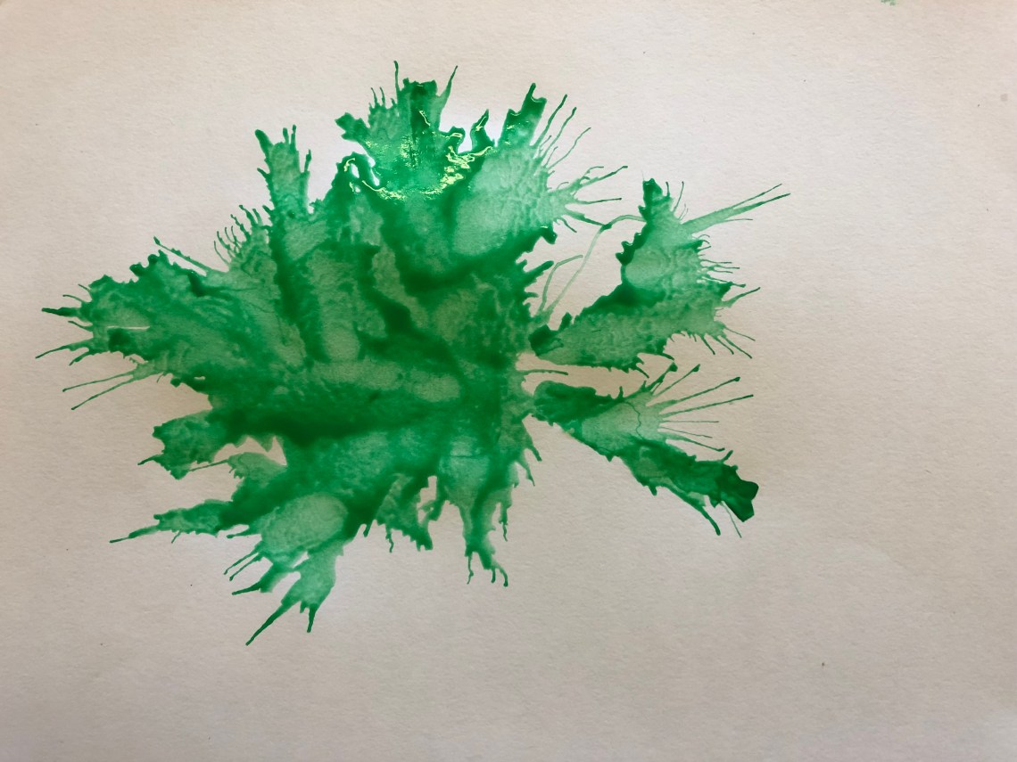 Droppa en blöt droppe vattenfärg på ett papper. Blås med sugröret i färgen då att färgen sprids ut.