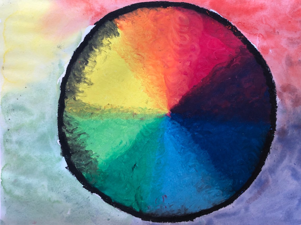 Efter sagan fick vi, och senare våra elever, rita en cirkel på ett A4. Sedan började vi sakta och säkert fylla i cirkeln med oljepastell. De tre grundfärgerna och grönt vid kvartarna. Noga, noga målades färgerna i med cirkelrörelser så kritan täcker pappret ordentligt. Börja alltid med den ljusaste färgen. Och vi fick förstås bara fyra färger, blått, gult, rött och så svart till ramen.