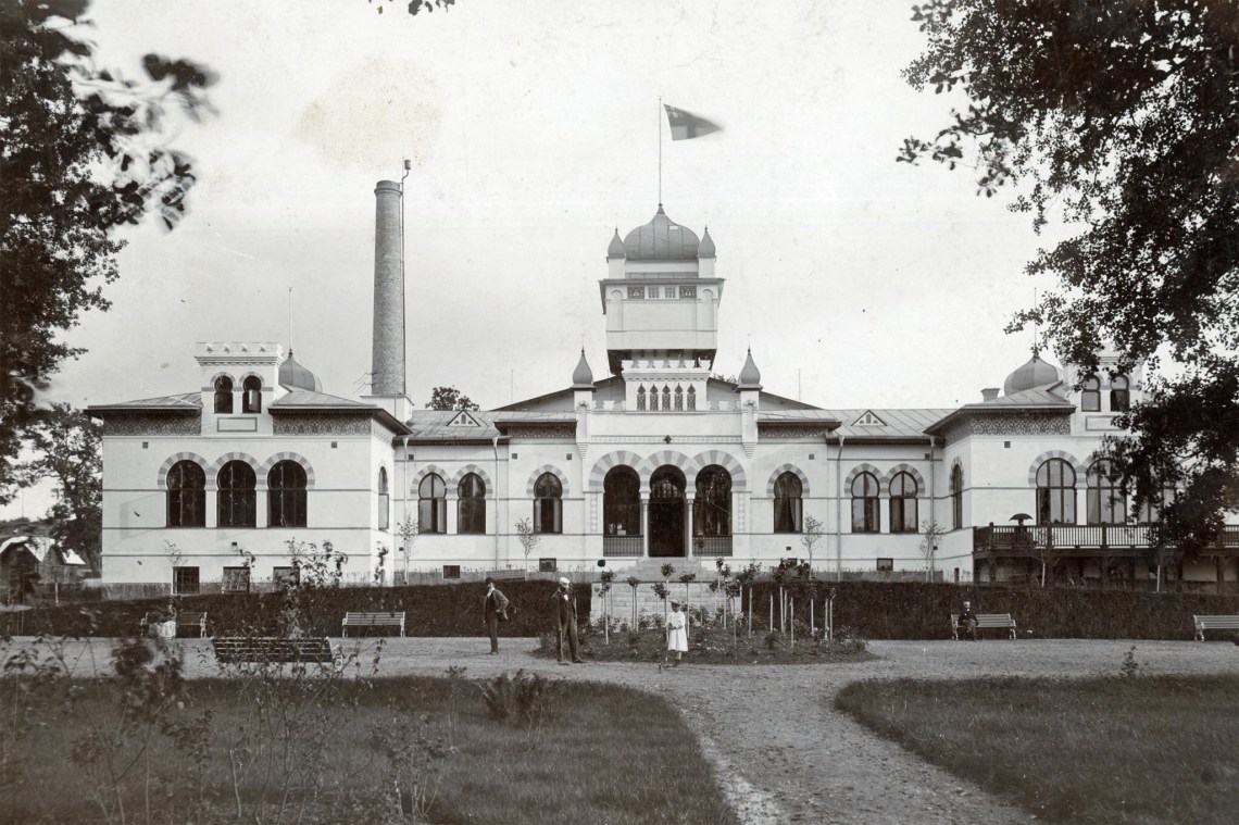 Själva kuranstalten bestod av två större byggnader och ser ut att vara hämtad ur ”Tusen och en natt” med många kupoler, hästskoformade fönster och i vitt. Notera att unionsflaggan är hissad.