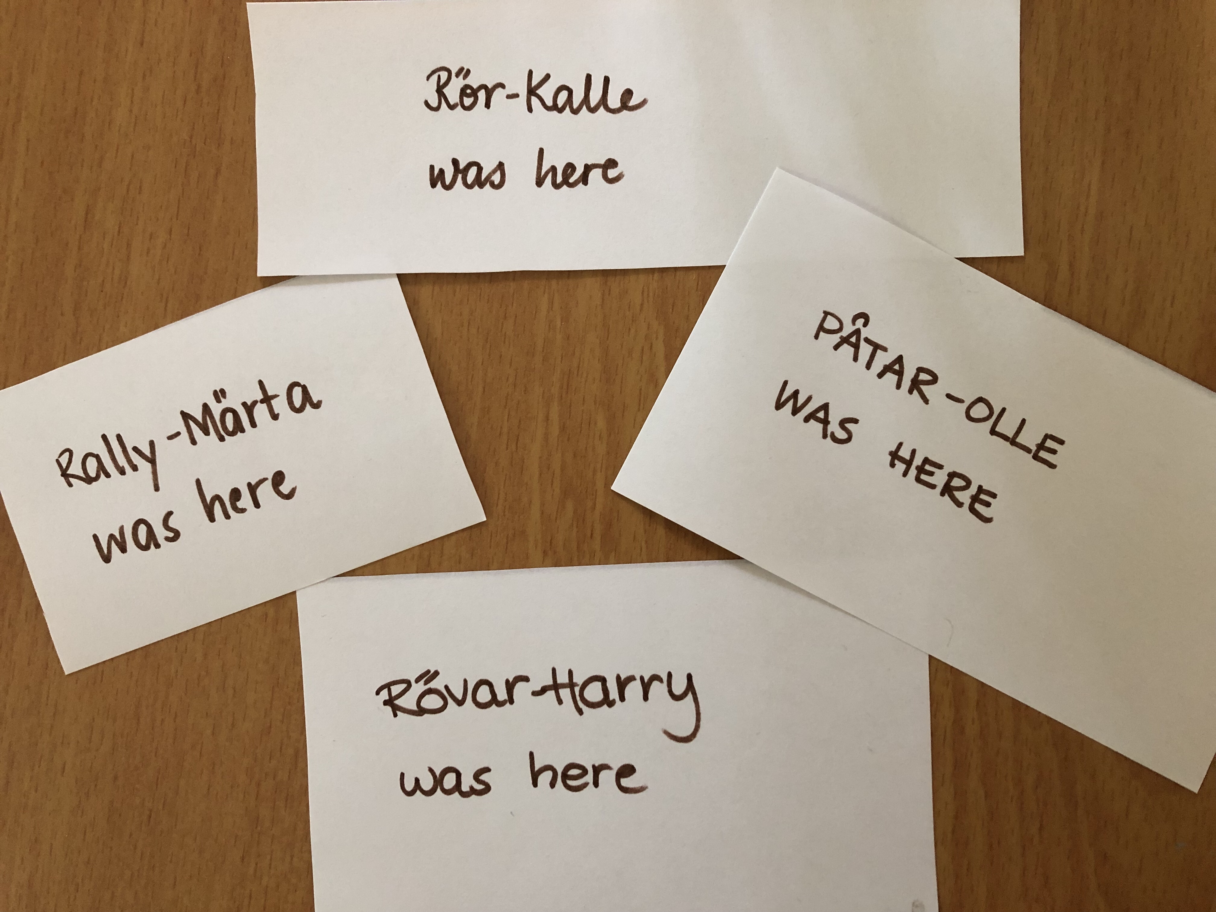 Uppgiften till eleverna får bli att jämföra sedeln med fyra olika handstilar (Rör-Kalles, Påtar-Olles, Rally-Märtas och Rövar-Harrys). Vems stämmer bäst överens med sedelns handstil? Kan det vara den personen som är tjuven? Fler ledtrådar behövs…