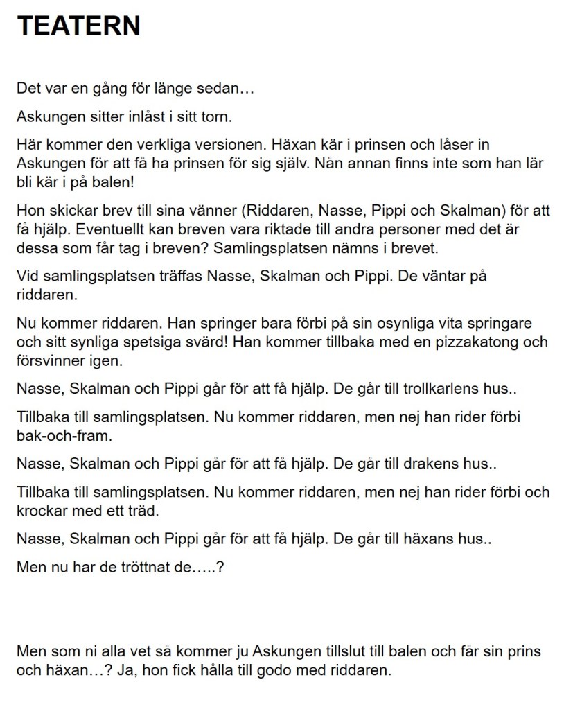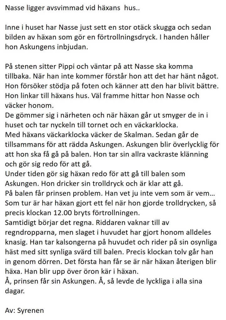 Ja, alltså den sista delen läste vi inte, utan stannade vid att Nasse, Skalman och Pippi har tröttnat. Sedan var det upp till alla elever att skriva slutet på historien.