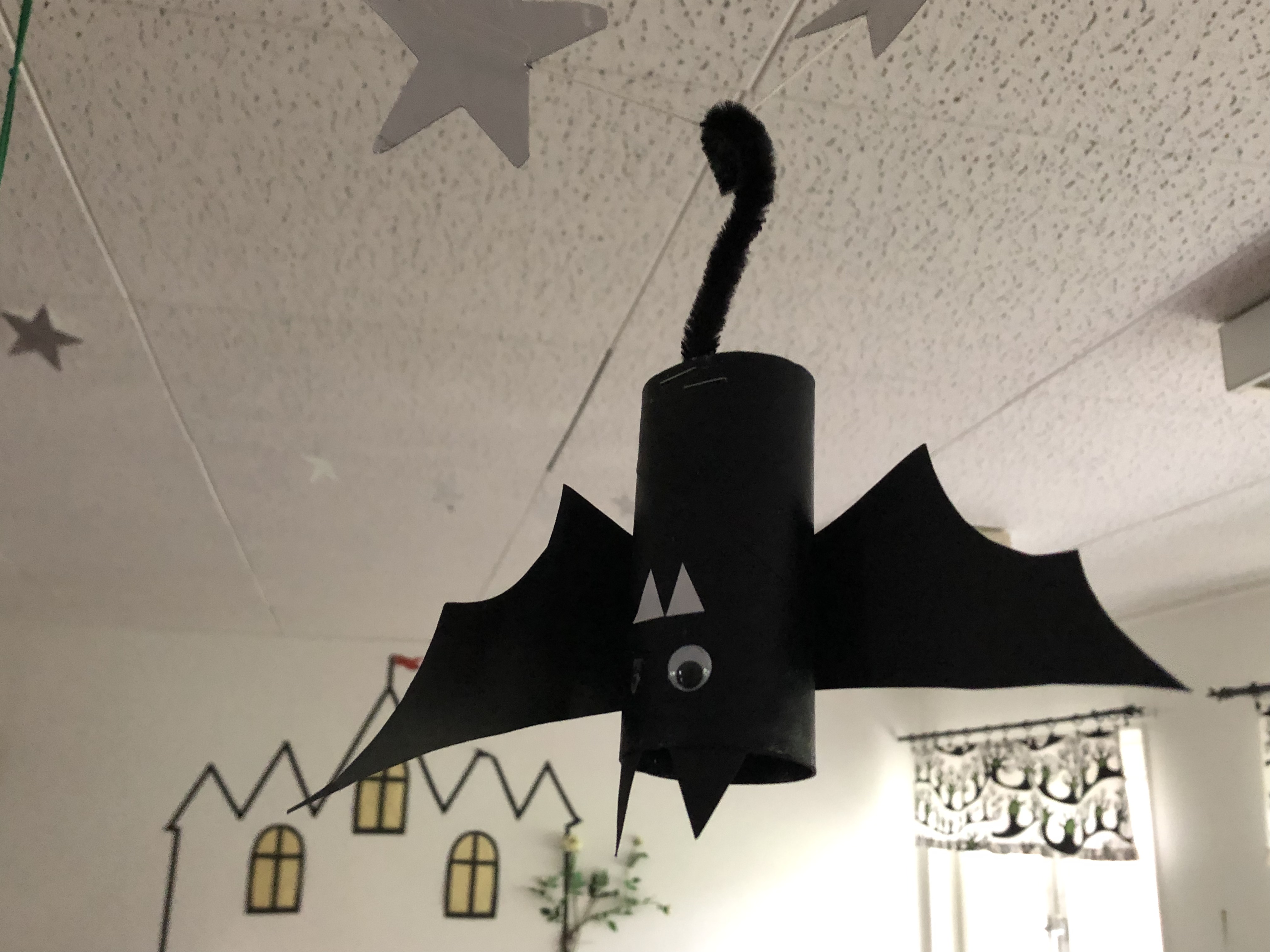 Till de hängande fladdermössen behövs en toarulle, svart flaskfärg, svart och vitt papper, piprensare och ögon…