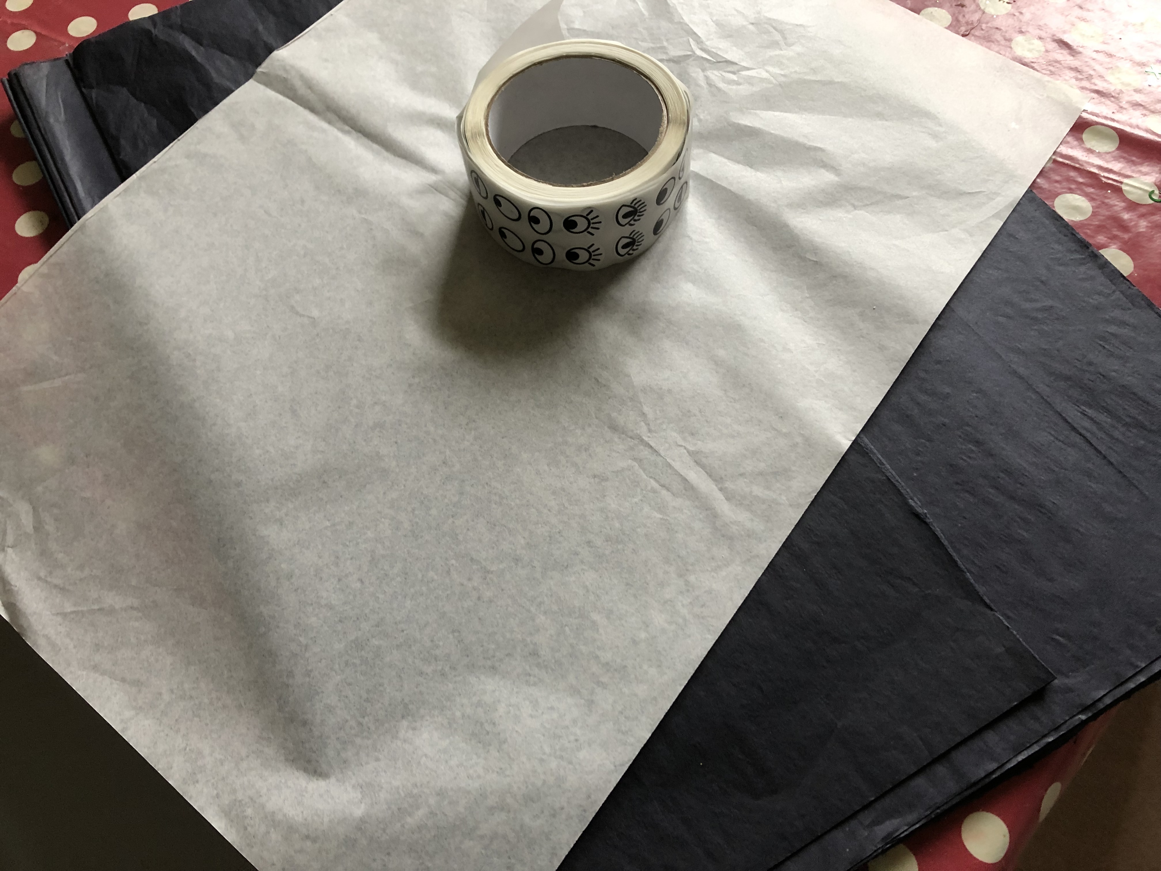 Till fönsterdekorationerna behövs silkespapper och svart papper. Det här blir också en övning i symmetri. Det är lättare att vika pappret dubbelt.