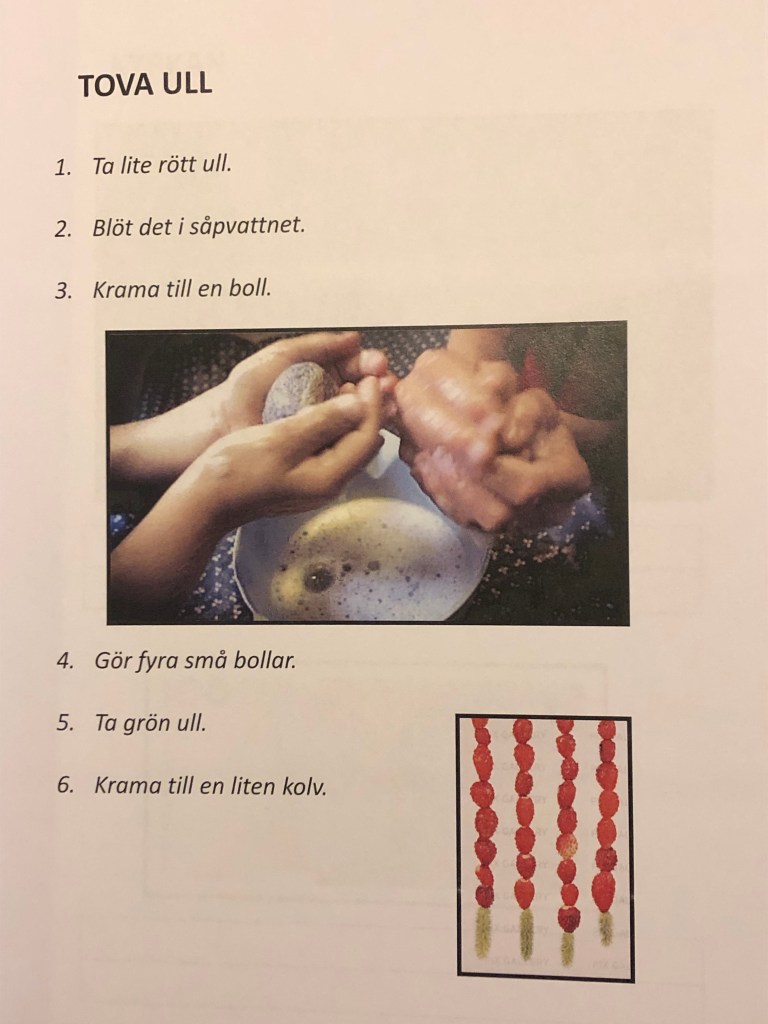 Något som går att göra i klassrummet är att tova ull. En enkel uppgift kan vara att tova små röda bollar, en liten grön kolv och sedan trä upp dessa på en grön garnbit.