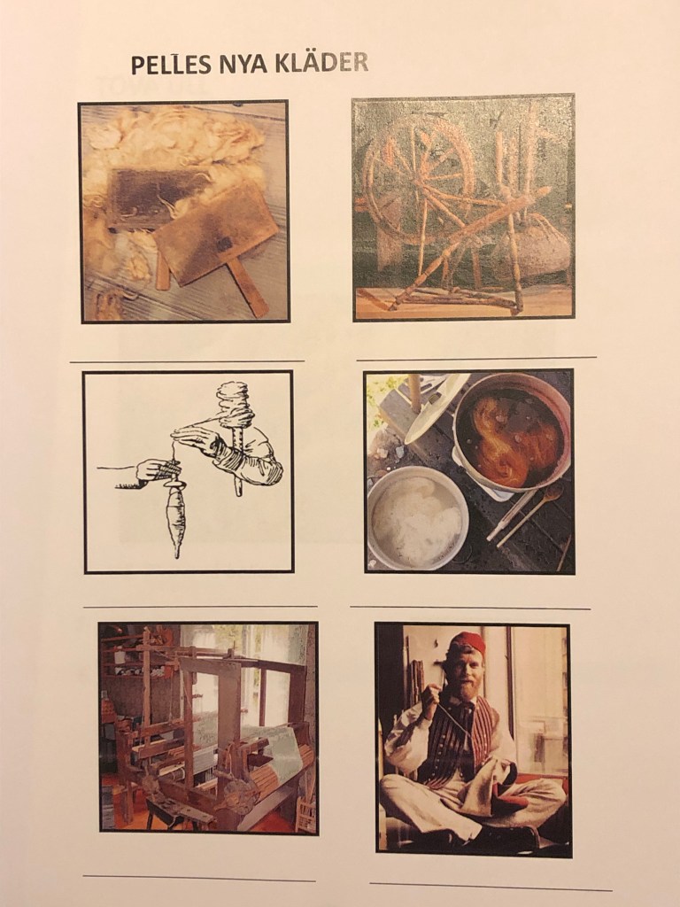 I boken ”Pelles nya kläder” av Elsa Beskow kan eleverna få följa hur ull spinns till tråd, vävs till tyg och sys till kläder.