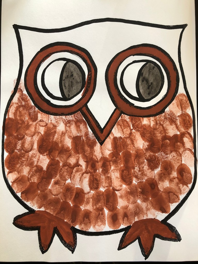 Vi hade en mall på en uggla, och så fick eleverna tumma fjädrarna. Man kan ju tycka vad man vill om mallar, men resultatet blev rätt häftigt.