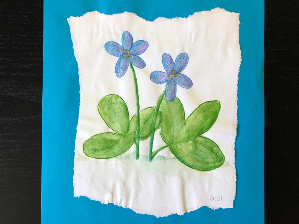 Då mindes jag min gamla bilduppgift om blåsippor. Vi skissade först försiktigt en blåsippa och den är tacksam eftersom den har ganska enkla former. Sedan målade vi med akvarellpennor. Vi målade blommorna blå med några lila stråk. Sedan ritade vi gula prickar i mitten och gröna blad. Blötte en mjuk pensel litegrann och penslade försiktigt ut akvarellfärgen. Rev kanten på teckningen och klistrade upp på en passande bakgrund.