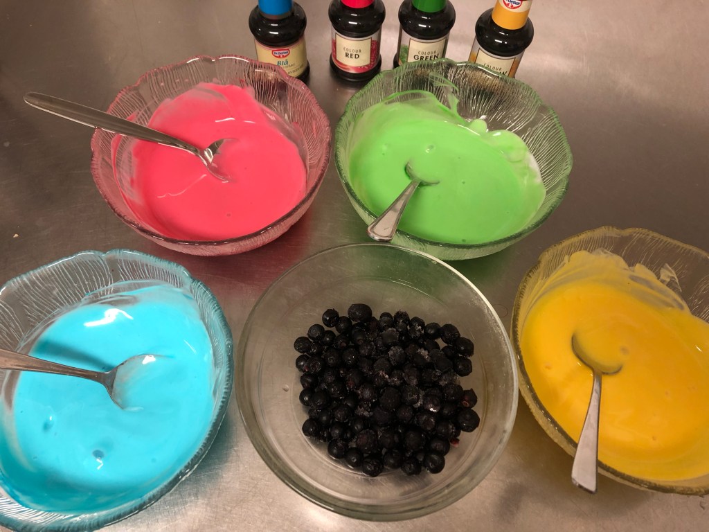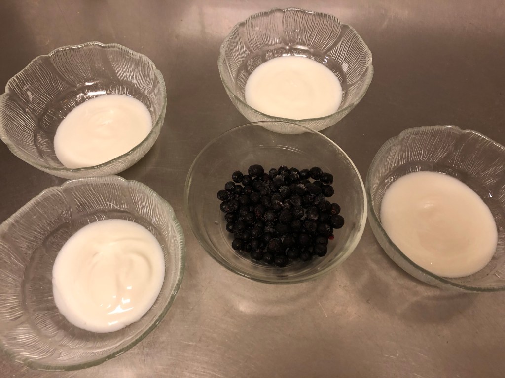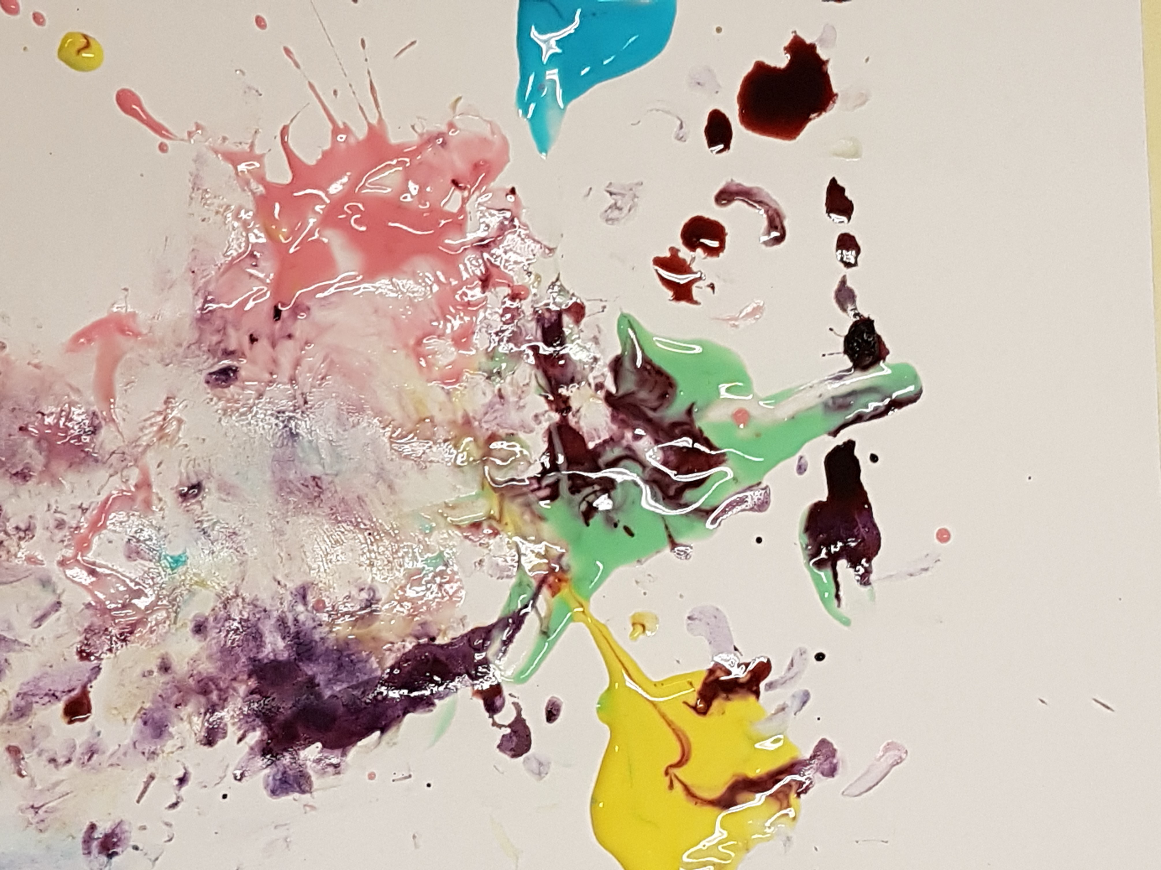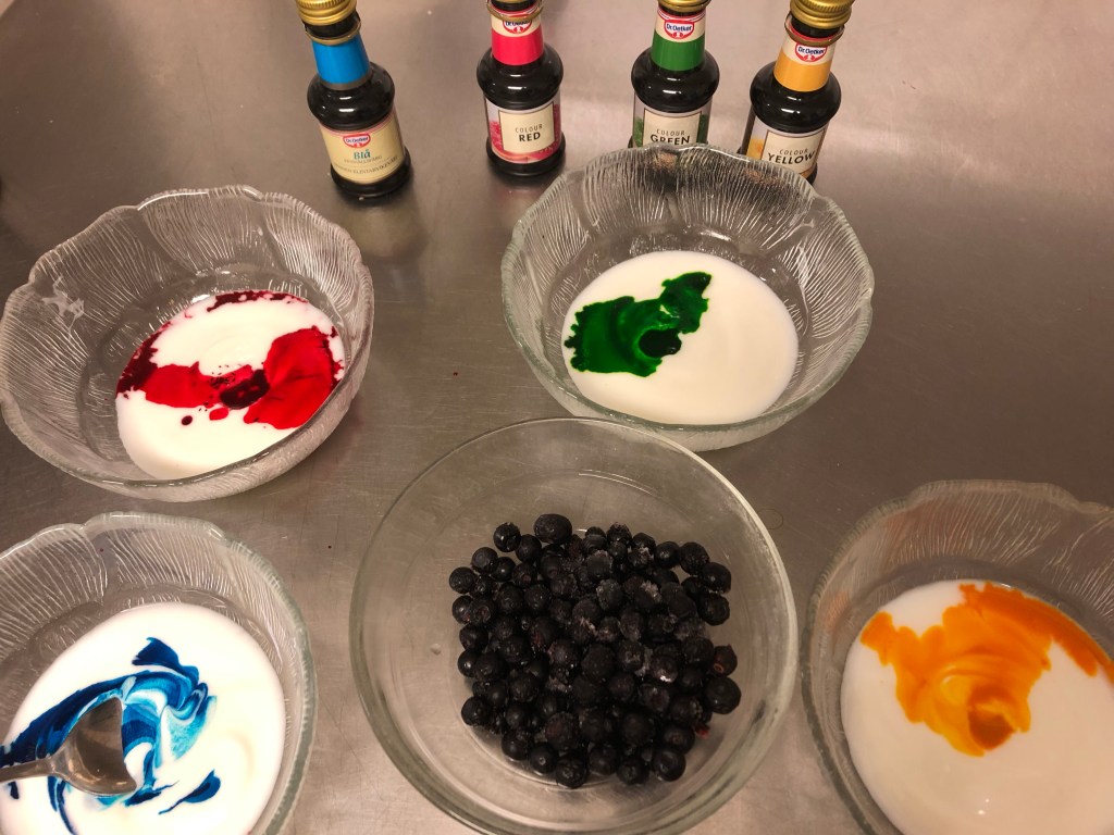 Låt barnet börja med ett par klickar yoghurtfärg. Sedan kan barnet kladda, smaka och skapa efter intresse. Fyll på fler färger och mer yoghurt när det behövs.