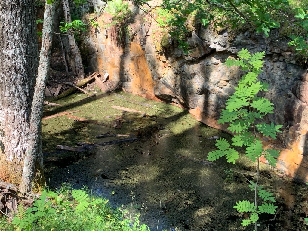 För att komma över sundet till gruvan får ni ta er med en flotte. Förr fanns här en bro, men den är borta sedan länge.