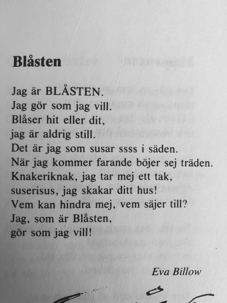 Eva Billow har skrivit en härlig dikt om blåsten som också passar bra på hösten.