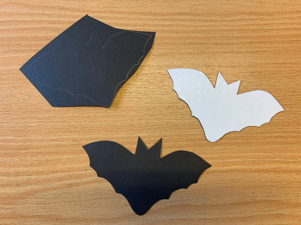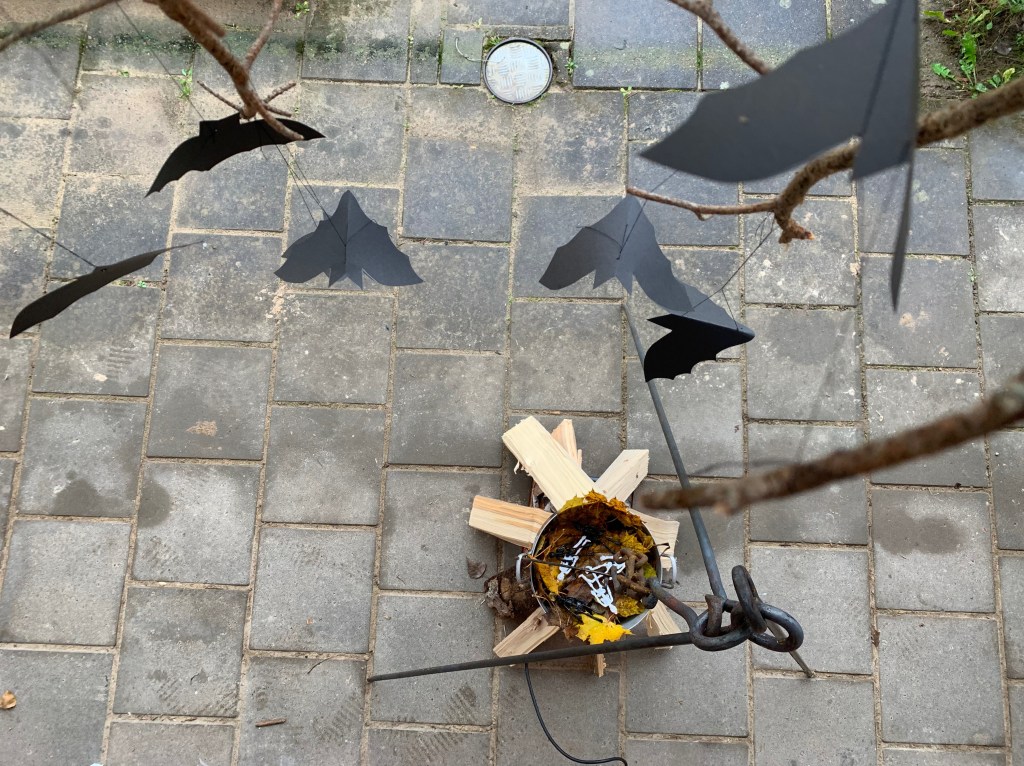 Fladdermössen gjorde vi utifrån en mall, lite tråkigt, men gick fortast. Sedan hängde vi upp alla fladdermöss i en gren.