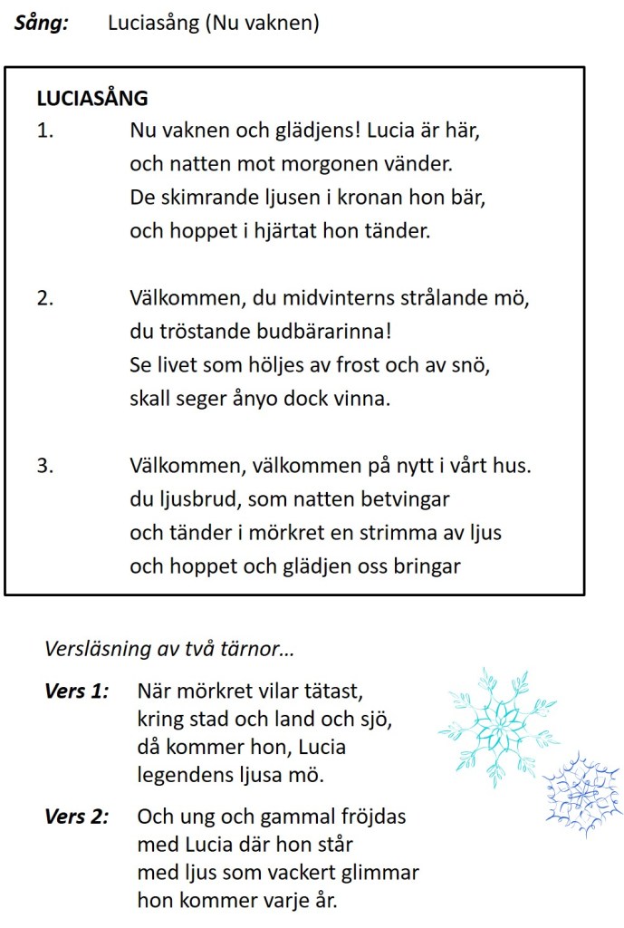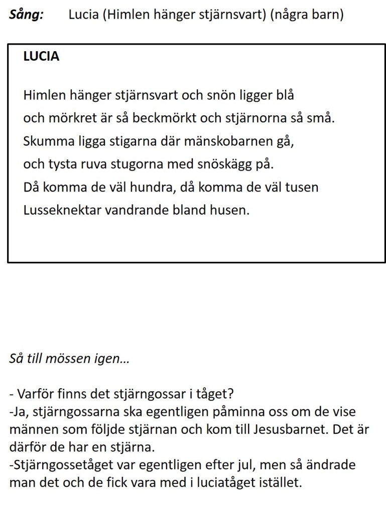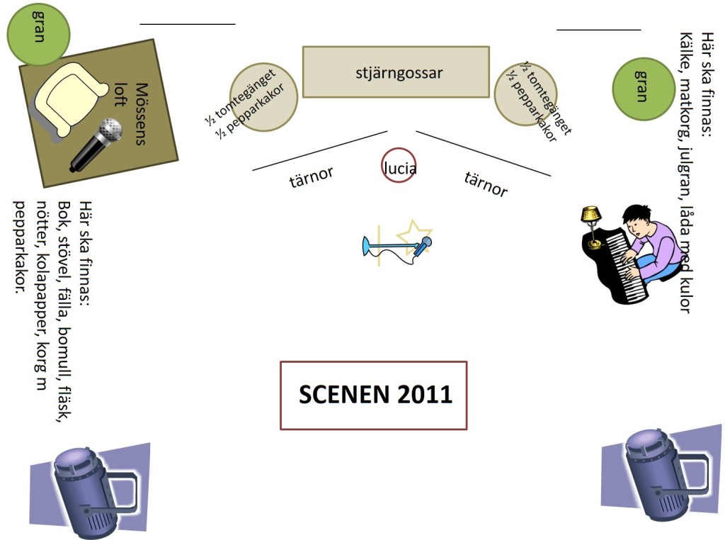 På den skolan där jag har arbetat mestadels under min lärarkarriär var det alltid åk 3 som stod för luciatåget. 2011 var det mössens tur att presentera lucian med tärnor, stjärngossar, nissar och pepparkakor.