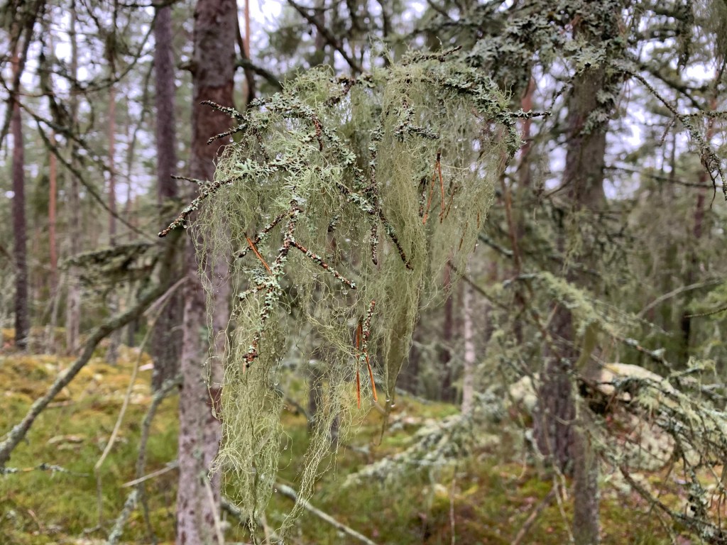 Titta, här har trollfar haft så bråttom att lite av hans skägg har fastnat i trädet. Om du besöker Trollstenen ska du hålla utkik, för lite varstans sitter det trollskägg på träden. Om jag får gissa, tror jag, att trollen har varit här och lekt när de hört vällingklockan och fått bråttom iväg. Men det är vad jag tror!