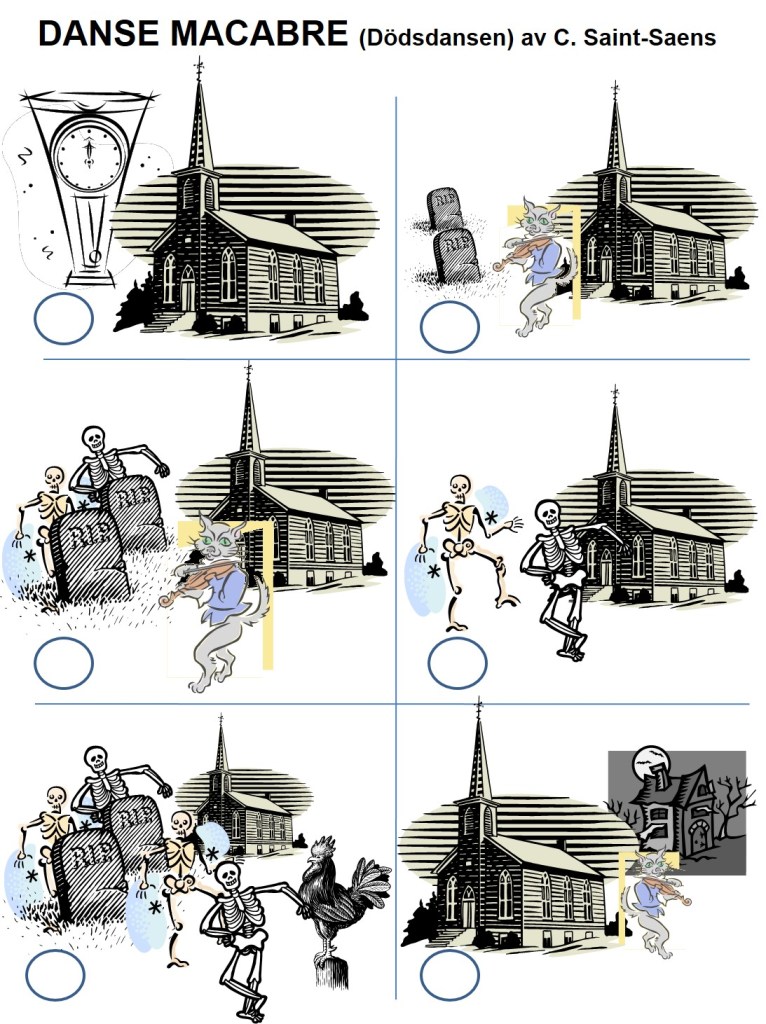 Camille Saint-Saëns är en fransk kompositör som verkade på 1800-talet. Han fick inspiration till den här kompositionen från en dikt om om de dödas dans natten till alla helgons natt. Detta är ett riktigt Halloween-stycke med andra ord. Stycket fick namnet Danse Macabre, eller dödsdansen. Det blev ingen direkt succé när det framfördes första gången. Folk tyckte bara att det var konstigt, men efter ett tag vände det och folk förstod tjusningen. För att mana fram intryck av de dödas dans använde kompositören disharmoniska klanger. Xylofoner fick illustrera rasslandet av skeletten. Se om ni kan höra allt detta i musiken. Det allra första som händer är att klockan slår – tolv slag!