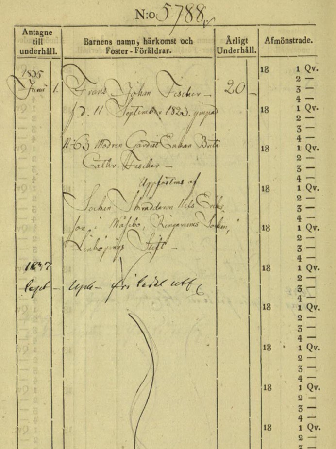 Frans Johan Fischer föds 1823 i Stockholm, men jag har fortfarande inte hittat hans födelsenotis i någon av Stockholm födelseböcker. Länge visste jag inte mer än att han 1835 lämnas på Allmänna barnhuset av sin mor gardistänkan Brita Catharina Fischer.
