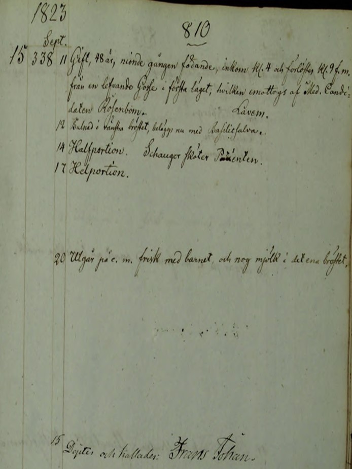 Den 2 augusti 1820 föds dottern Christina Charlotta Wilhelmina och hon bör vara det sjunde barnets om jag ska våga tro på Allmänna barnbördshusets anteckningar. Åttonde barnet vet jag ingenting om, men den 11 september 1823 föds det nionde barnet, sonen Frans Johan, min farmors farfars far.