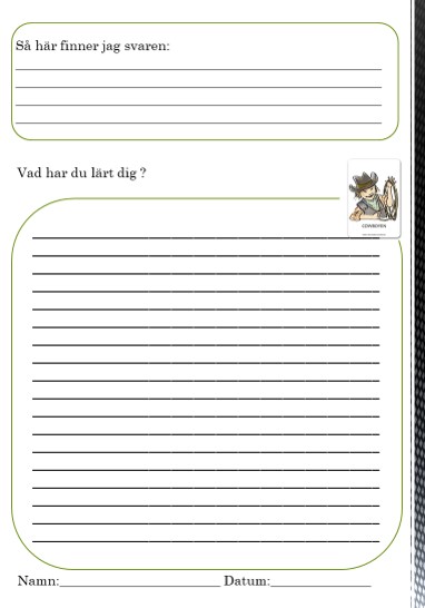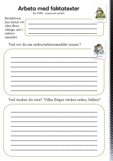 Till den här lektionen hör också ett arbetsblad med en fram- och baksida och ett läxblad. Bilderna på detektiven, spågumman och cowboyer är hämtade från materialet läxfixarna från projektet En läsande klass, med bl.a. Martin Widmark.